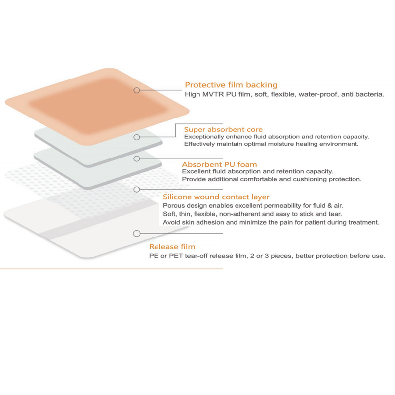 A szegélyezett szilikonhab kötszer egy öntapadó kötszer egy további szegélyezett éllel, amely védőrétegből, szuper nedvszívó magból, nedvszívó PU habból, sziikon sebkontaktrétegből és elválasztó borításból áll.
