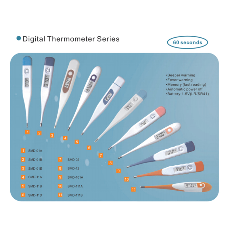 | SMD-01A | 15,5x6,5 mm | 127x18x10 mm | 10,5 g | 32,0 ℃-42,0 ℃ 89,6F-107,6F | ±0,1 ℃ (35,5 ℃ -42,0 ℃)/ ±0,2F(95,9F-107,6"F) ±0,2 ℃ (< 35,5 ℃) ±0,4 F (< 95,9 F) | 0,1 ℃/ 0,1F | 60 másodperc | ||