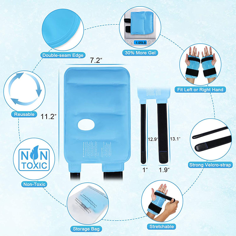 Készítsen hideg kompressziót a rugalmas pánttal a sérült csukló körültekeréséhez, hogy felgyorsítsa a kéztőalagút szindrómából való felépülést és a műtét utáni gyógyulást, csökkentse a sportsérülésekkel kapcsolatos zúzódásokat és duzzanatot, valamint enyhítse a krónikus ízületi fájdalmakat. A jégcsomag használatának 4 módja van, az ujjakra és a csuklóra célozva. A gél szivárgásának megakadályozása érdekében a csukló jégtakaró dupla varrás technológiát alkalmaz a jégcsomag szélének lezárására.