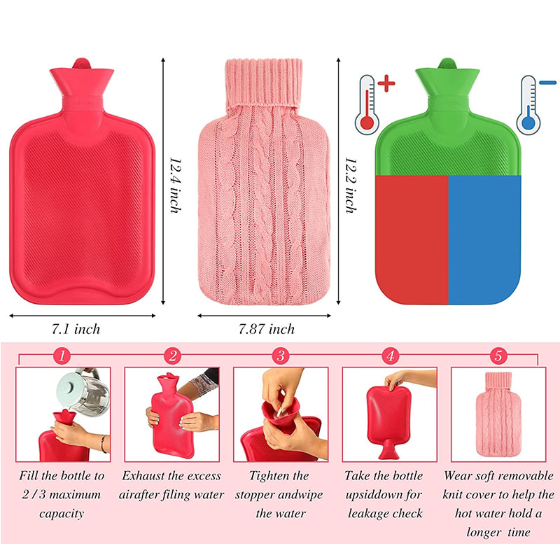 ezek a vizes gumipalackok nemcsak forró vízzel tölthetik fel, hogy enyhítsék az izomfájdalmakat, stresszt vagy görcsöket, derékfájást, menstruációs kényelmetlenséget nőknél és így tovább, hanem a hideg vizet is feltölthetik, hogy hideg borogatásként szolgáljanak láz esetén és csökkentsék a duzzanatot a sérülések esetén.