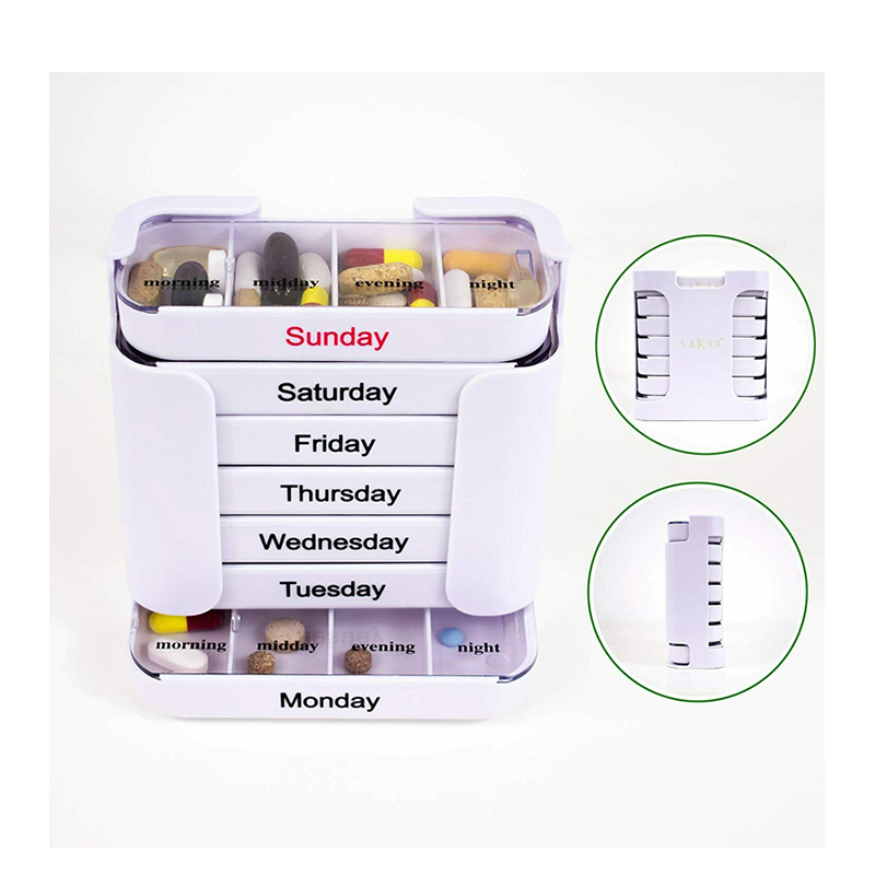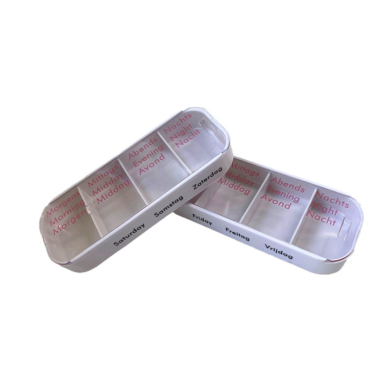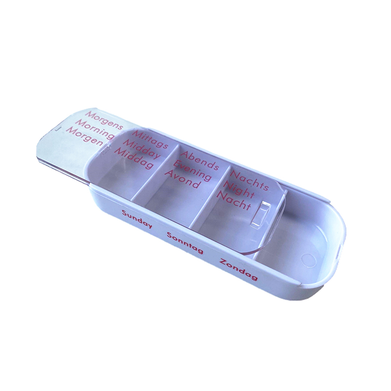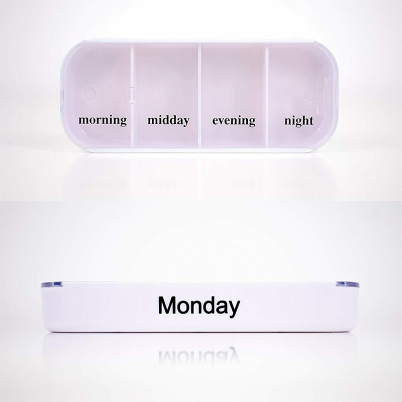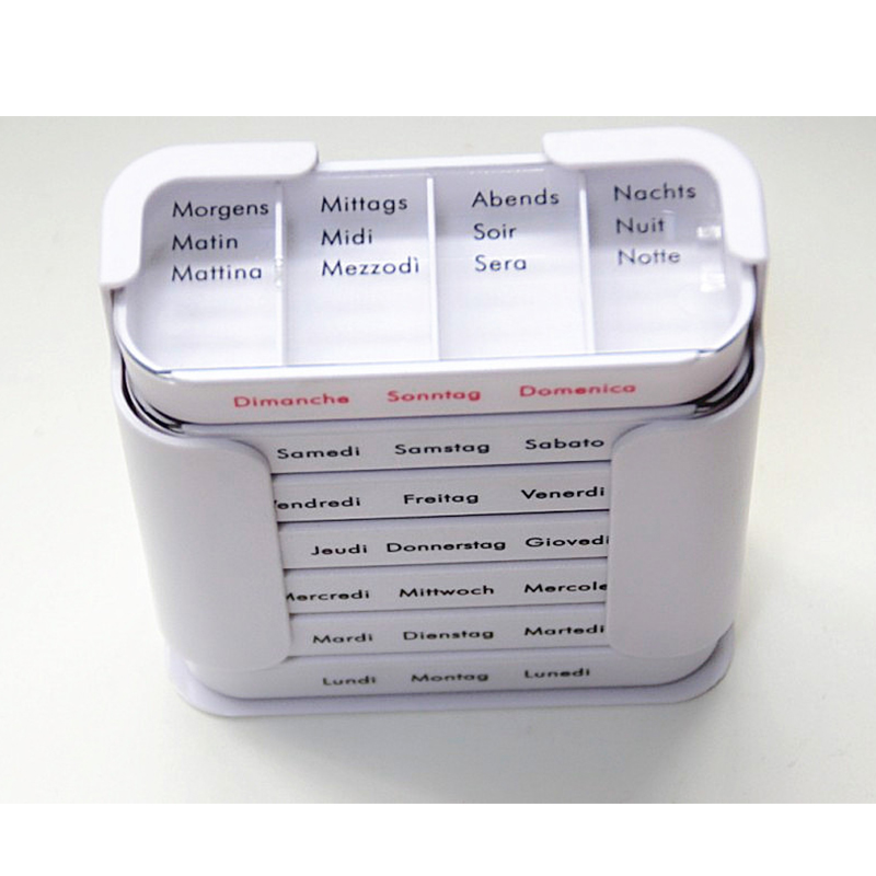 A külső tok átlátszó, és minden tálca egyedi élénk színekkel rendelkezik, így a felhasználó könnyen megkülönböztetheti a hét napjait.