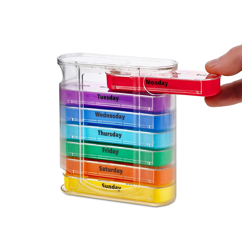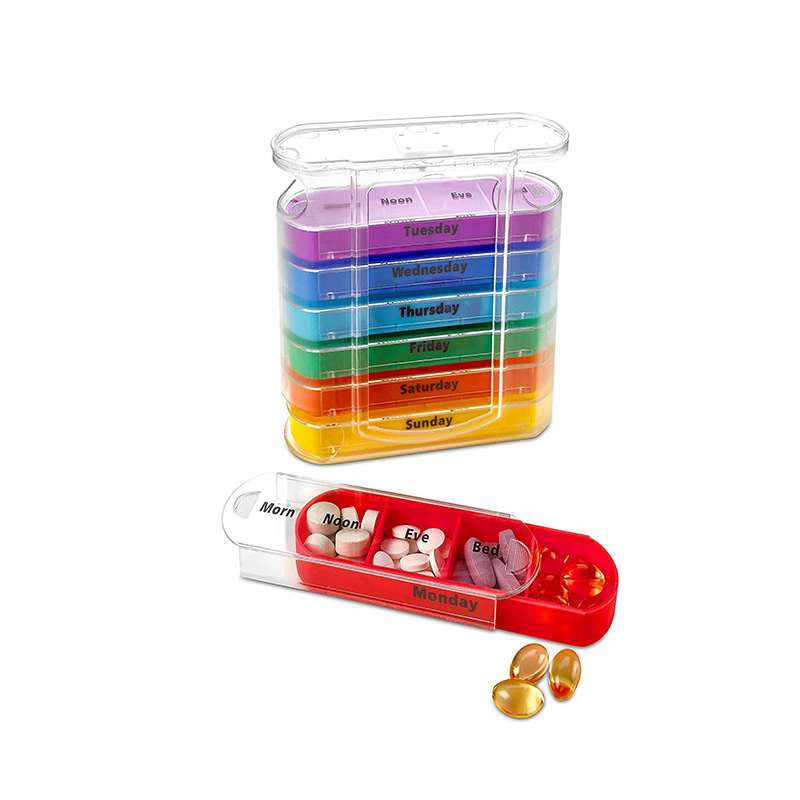 A külső tok átlátszó, és minden tálca egyedi élénk színekkel rendelkezik, így a felhasználó könnyen megkülönböztetheti a hét napjait.