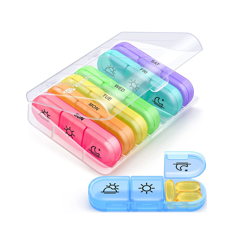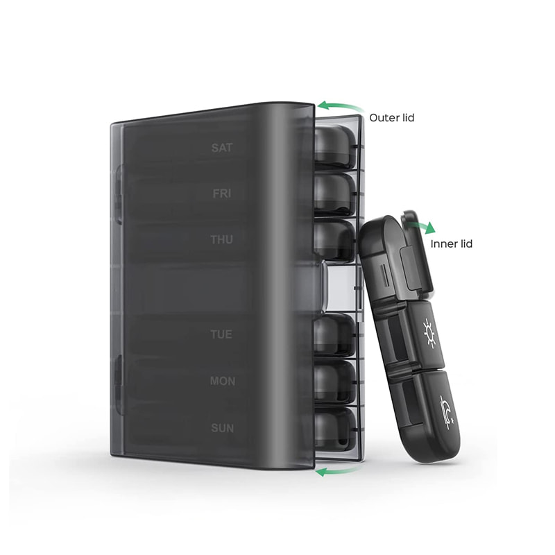 Külön tablettatartó, ez a tablettaadagoló 7 mozgatható vitamin-rendszerezővel rendelkezik, amelyek minden nap külön-külön kivehetők útközbeni használatra.