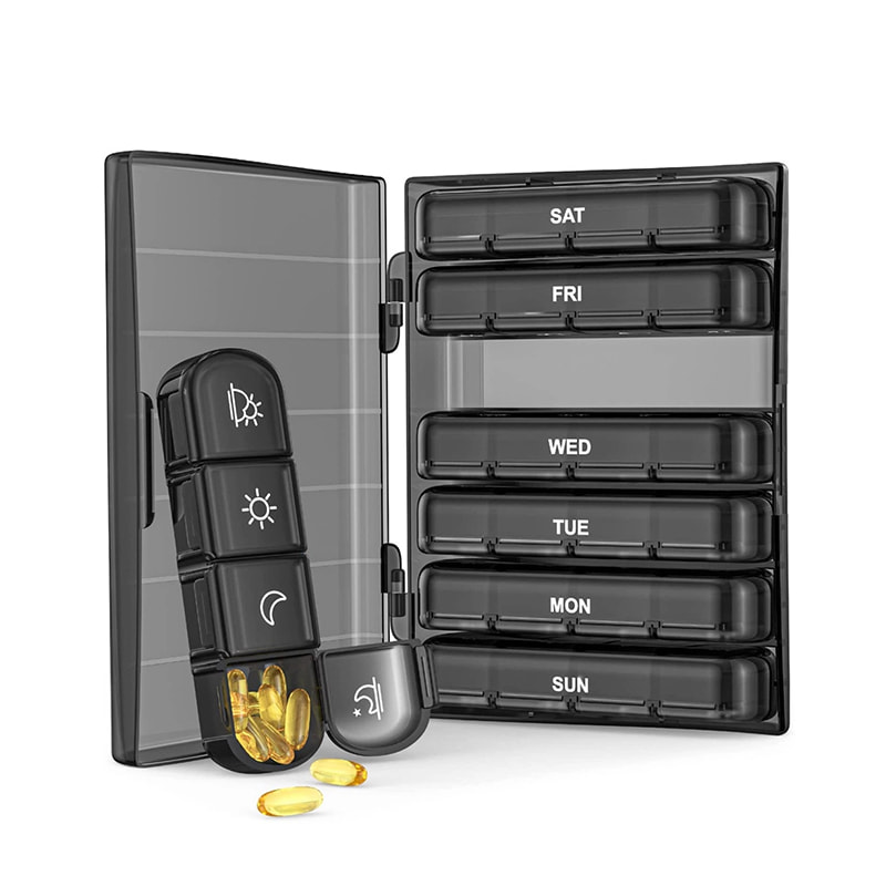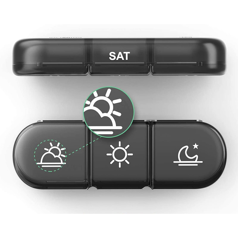 A nagyobb fekete héj 7 független tablettadoboz-rendezőt tud elhelyezni a tabletták egy hétre történő tervezéséhez.