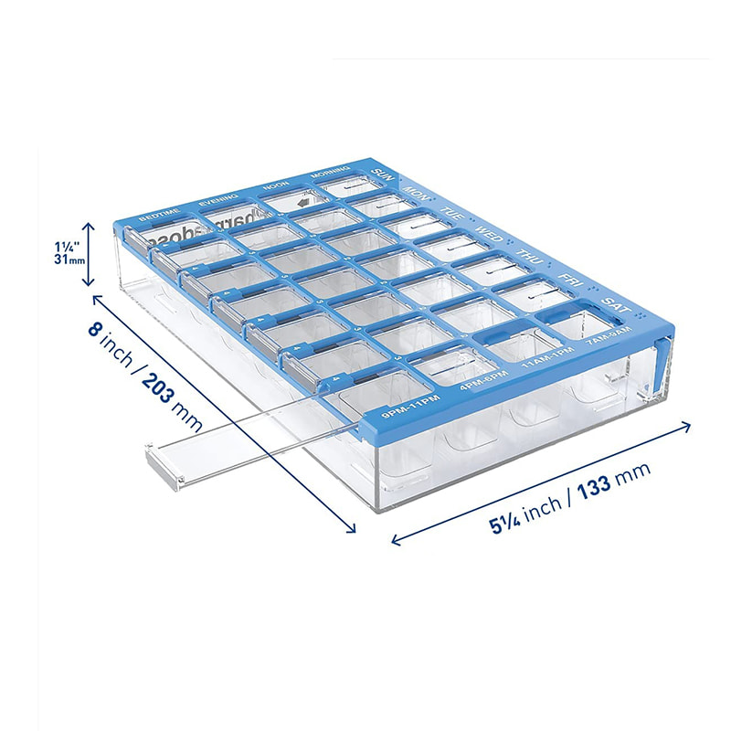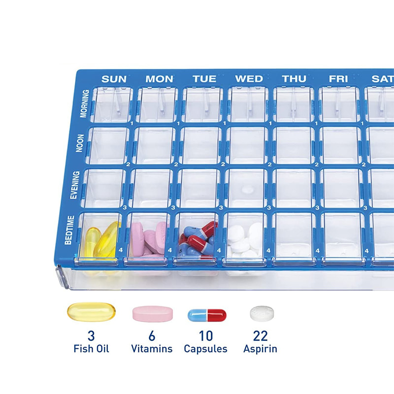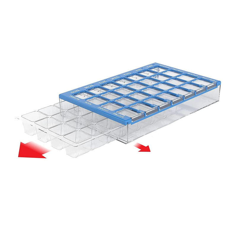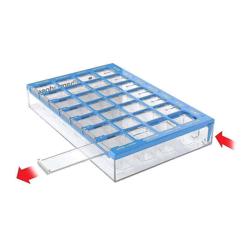 KÖNNYŰ HASZNÁLAT: A közepes felső fedél és a napi elcsúsztatható fedelek megkönnyítik a tervező kinyitását és a gyógyszer visszavételét