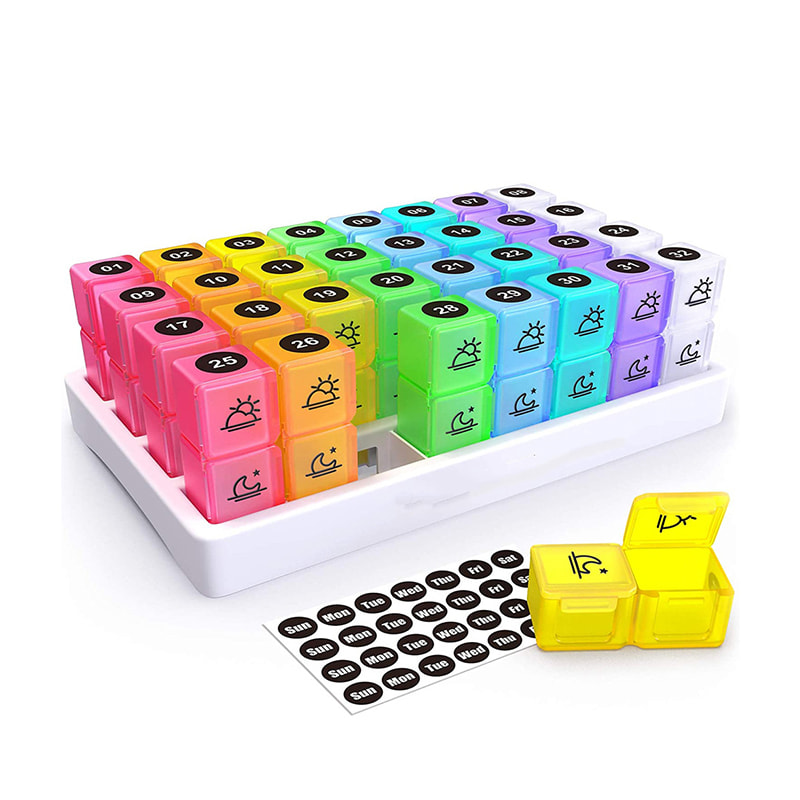 A 31 napos havi pirulaszervezőnk 32 számozott, világos és színes áttetsző tablettadobozt tartalmaz, amelyekből ellenőrizheti, hogy bevette-e az aznapi tablettát, és így nem kell több tablettadobozt tartania.