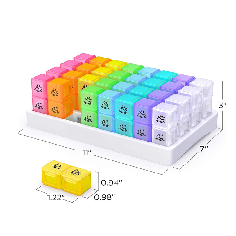 A színes havi tabletta rendszerező egy hónapra előre rendezi a táplálékkiegészítőket és/vagy tablettákat a kényelmes napi délelőtti/délutáni rekeszekben.