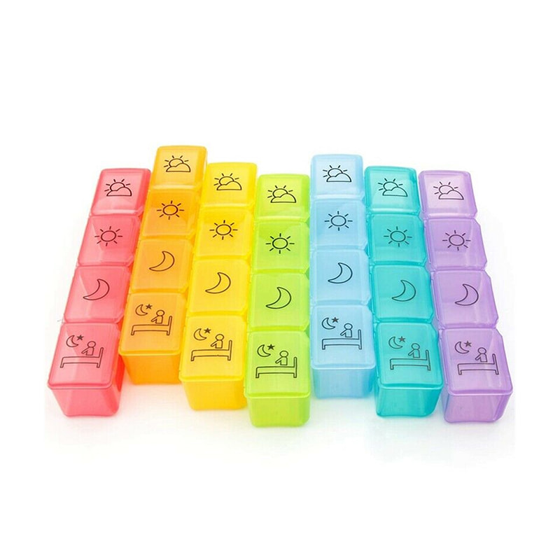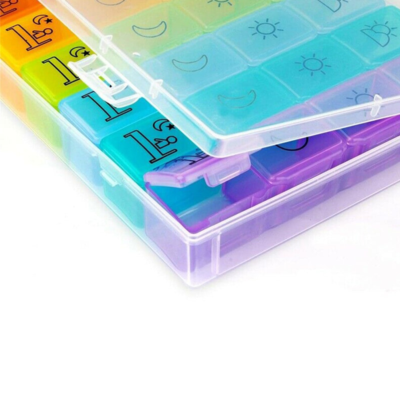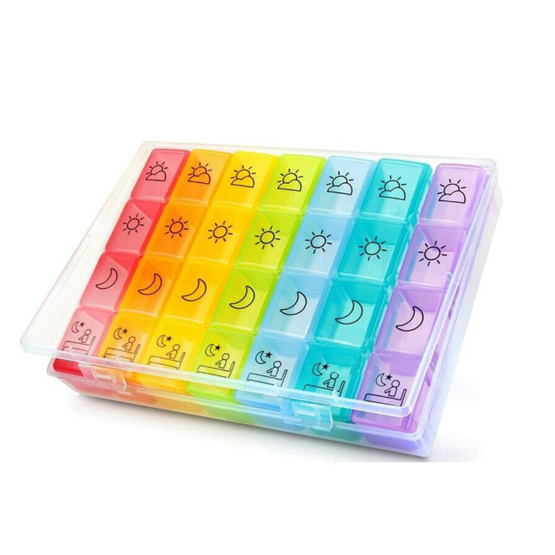 A 7 napos tablettakezelő naponta négyszer követi nyomon a gyógyszer szedését (reggel délelőtt). Dátumjelzők, amelyek emlékeztetnek arra, hogy mit kell vennie aznap.