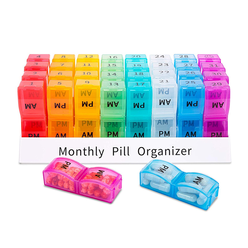 A 31 napos havi pirulaszervezőnk 32 számozott, világos és színes áttetsző tablettadobozt tartalmaz, amelyekből ellenőrizheti, hogy bevette-e az aznapi tablettát, és így nem kell több tablettadobozt tartania.