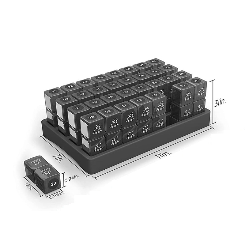 A színes havi tabletta rendszerező egy hónapra előre rendezi a táplálékkiegészítőket és/vagy tablettákat a kényelmes napi délelőtti/délutáni rekeszekben.