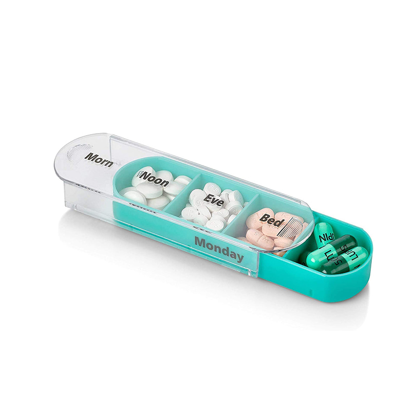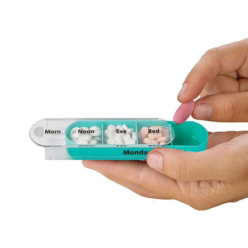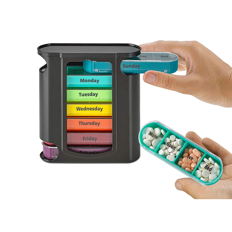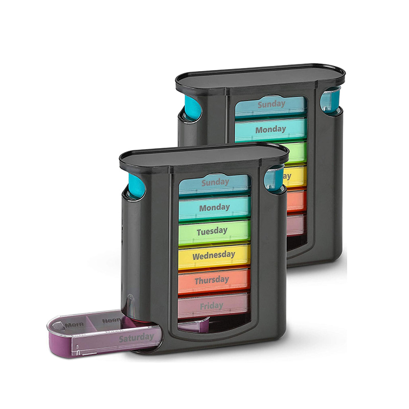 A külső tok átlátszó, és minden tálca egyedi élénk színekkel rendelkezik, így a felhasználó könnyen megkülönböztetheti a hét napjait.