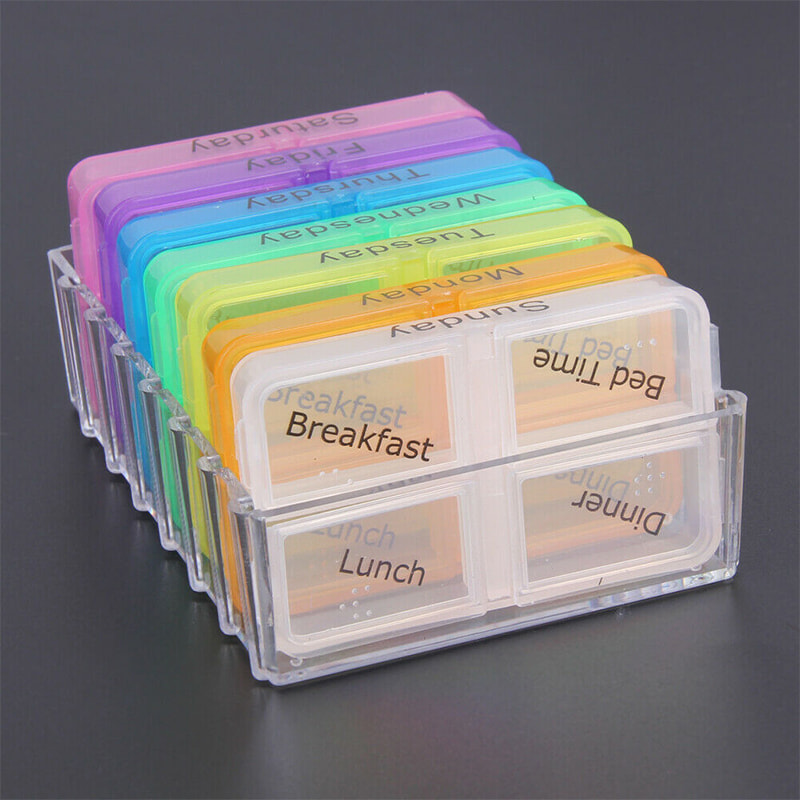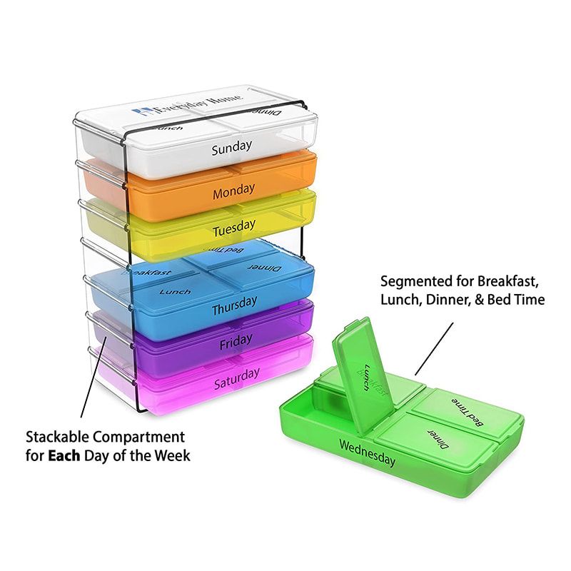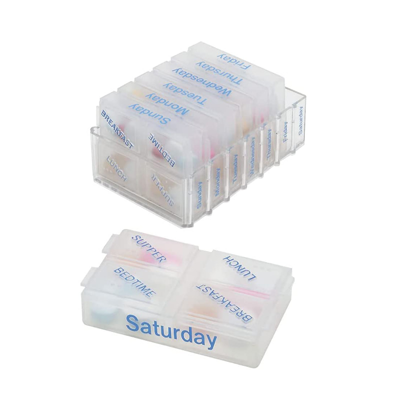 Ez a napi tablettatartály nagy, könnyen leolvasható címkékkel rendelkezik minden rekeszben, így mindig könnyedén megtalálhatja a gyógyszerét.