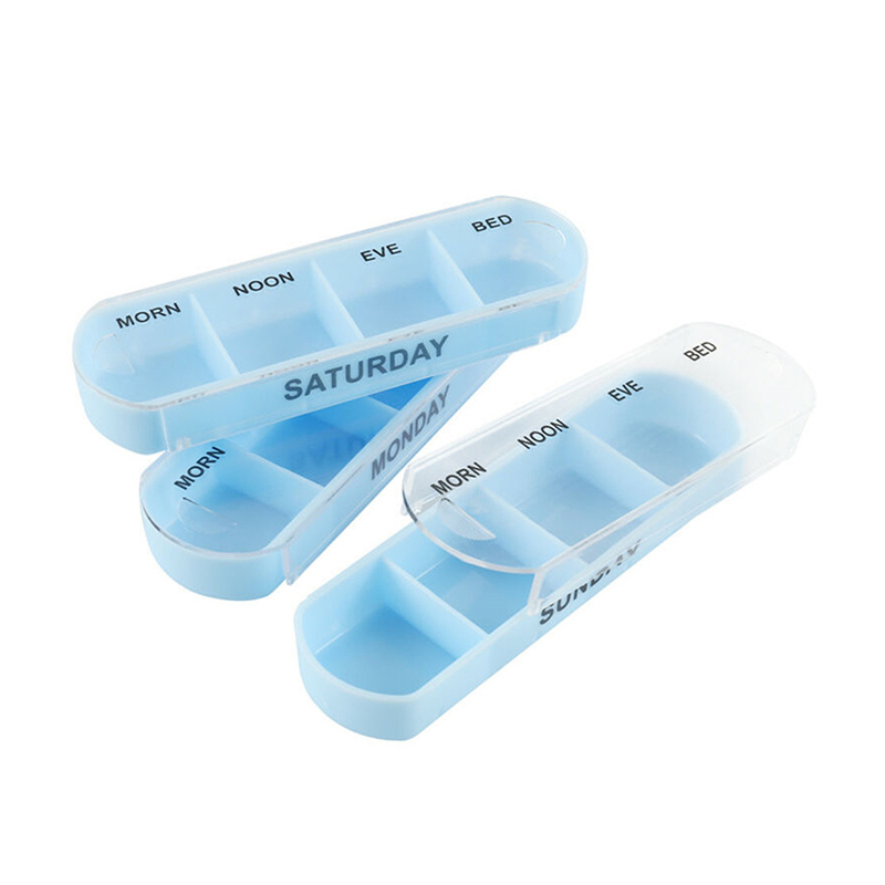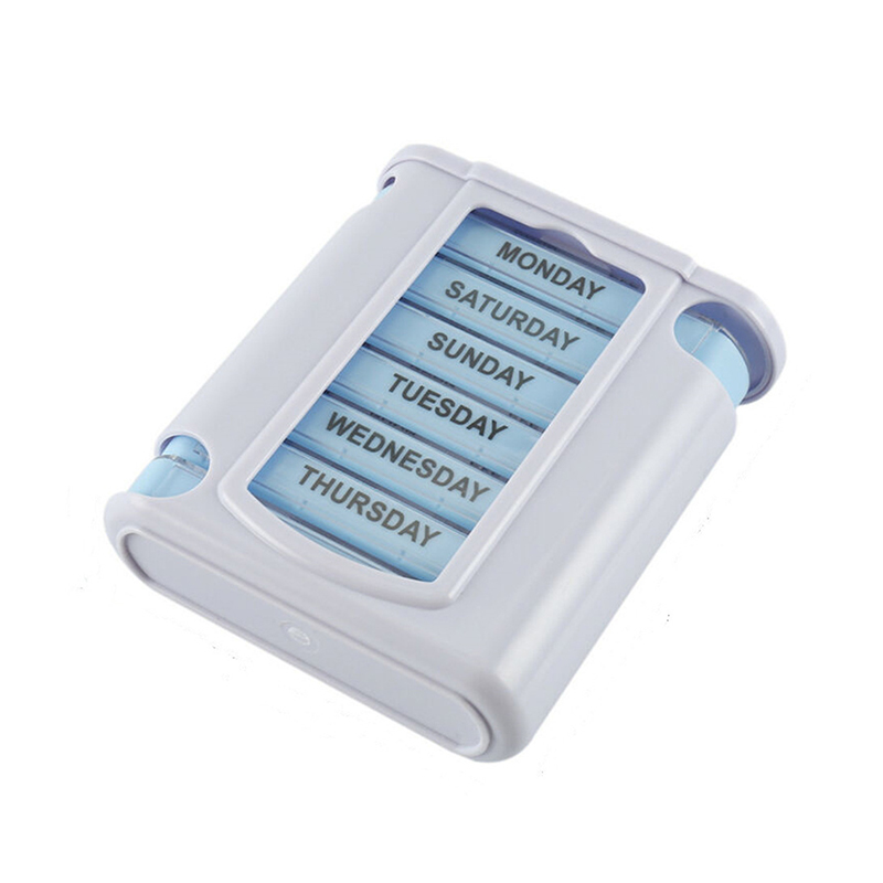 A külső tok átlátszó, és minden tálca egyedi élénk színekkel rendelkezik, így a felhasználó könnyen megkülönböztetheti a hét napjait.